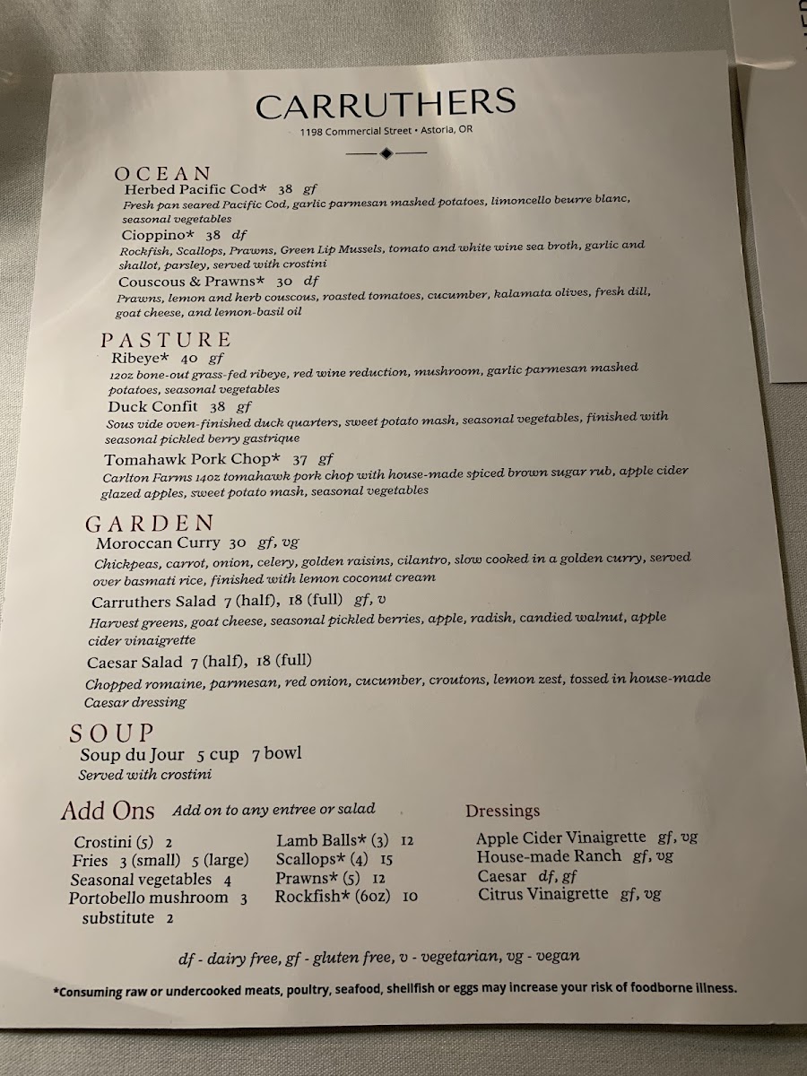 Welcome to Carruthers Restaurant, nestled in the heart of Astoria, Oregon. Renowned for its upscale atmosphere and exemplary service, Carruthers offers a menu that tantalizes the taste buds and elevates dining to an art form.